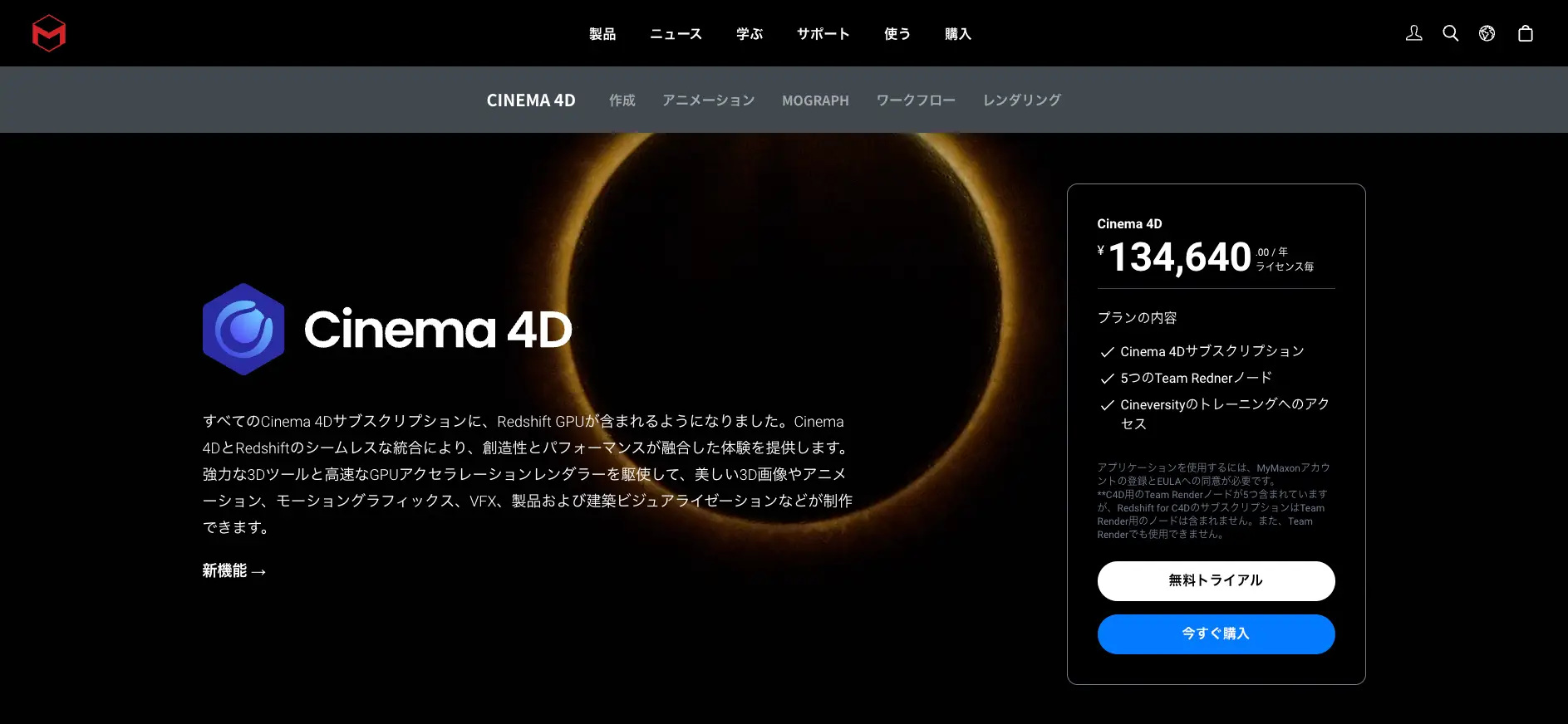 『Cinema 4D』はモーショングラフィックや映像制作に強い3Dソフトです。直感的な操作性と高い安定性で、放送業界や広告制作で利用されています。