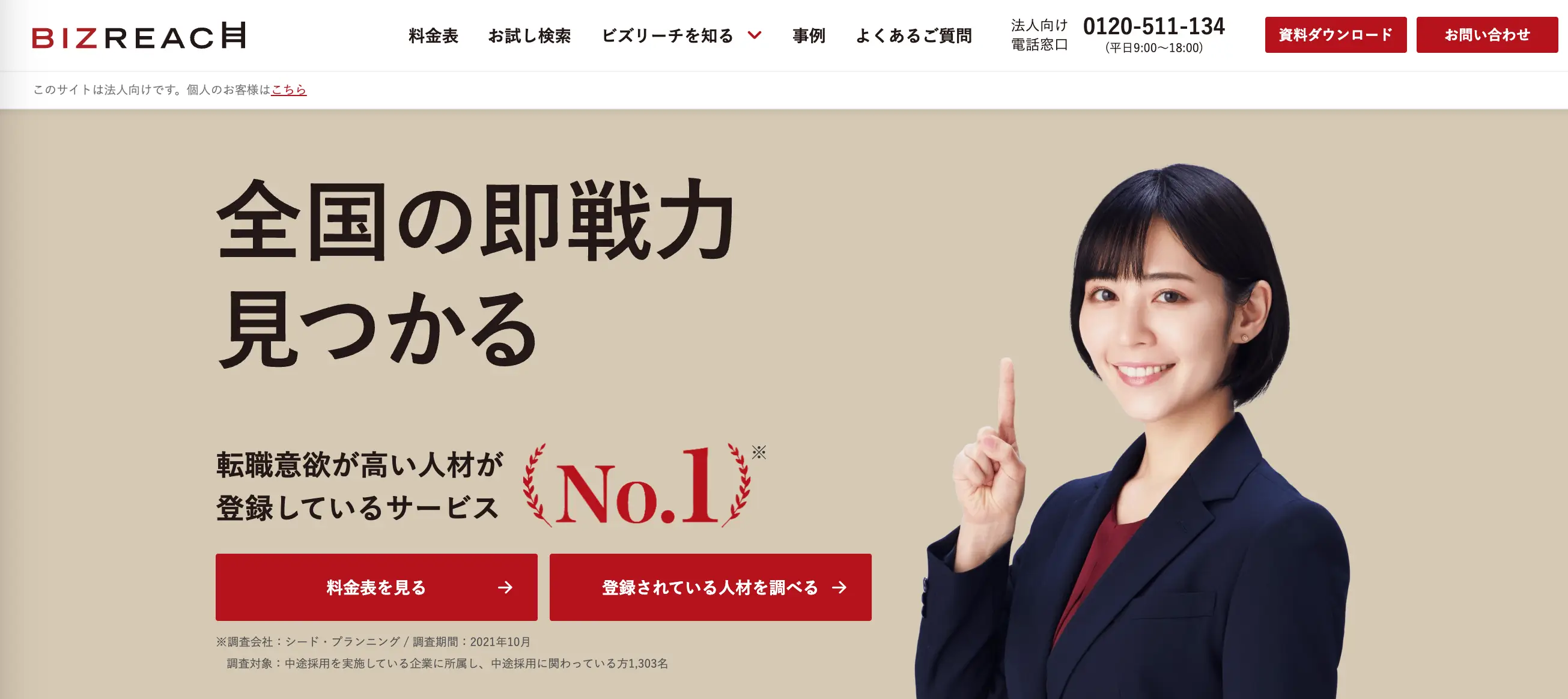 第1位 | ビズリーチ | ・即戦力人材に企業が直接アプローチできるダイレクトリクルーティング型サービス。 ・審査通過者281万人以上が登録し、全国6拠点で採用支援を展開。 |