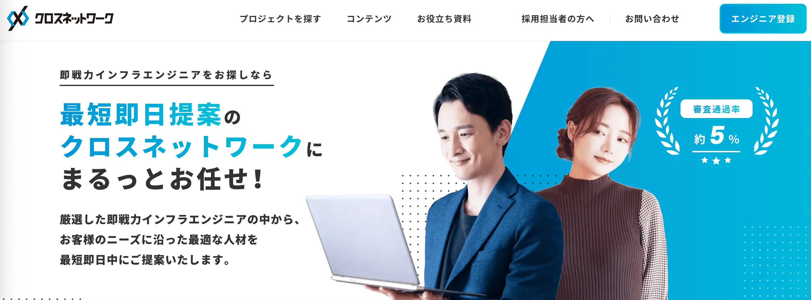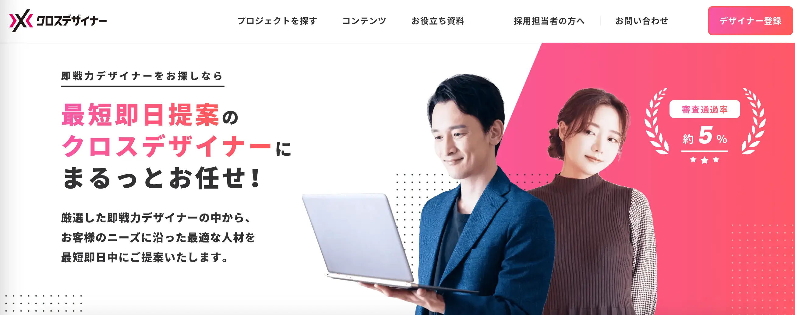 デザイナー専門の国内最大級エージェントサービス『クロスデザイナー』なら、厳正な審査を通過した即戦力デザイナーが7,000人以上在籍。採用コンサルタントが、自社に必要なデザイナーのスキルや要件をヒアリングして最適な人材を紹介します。