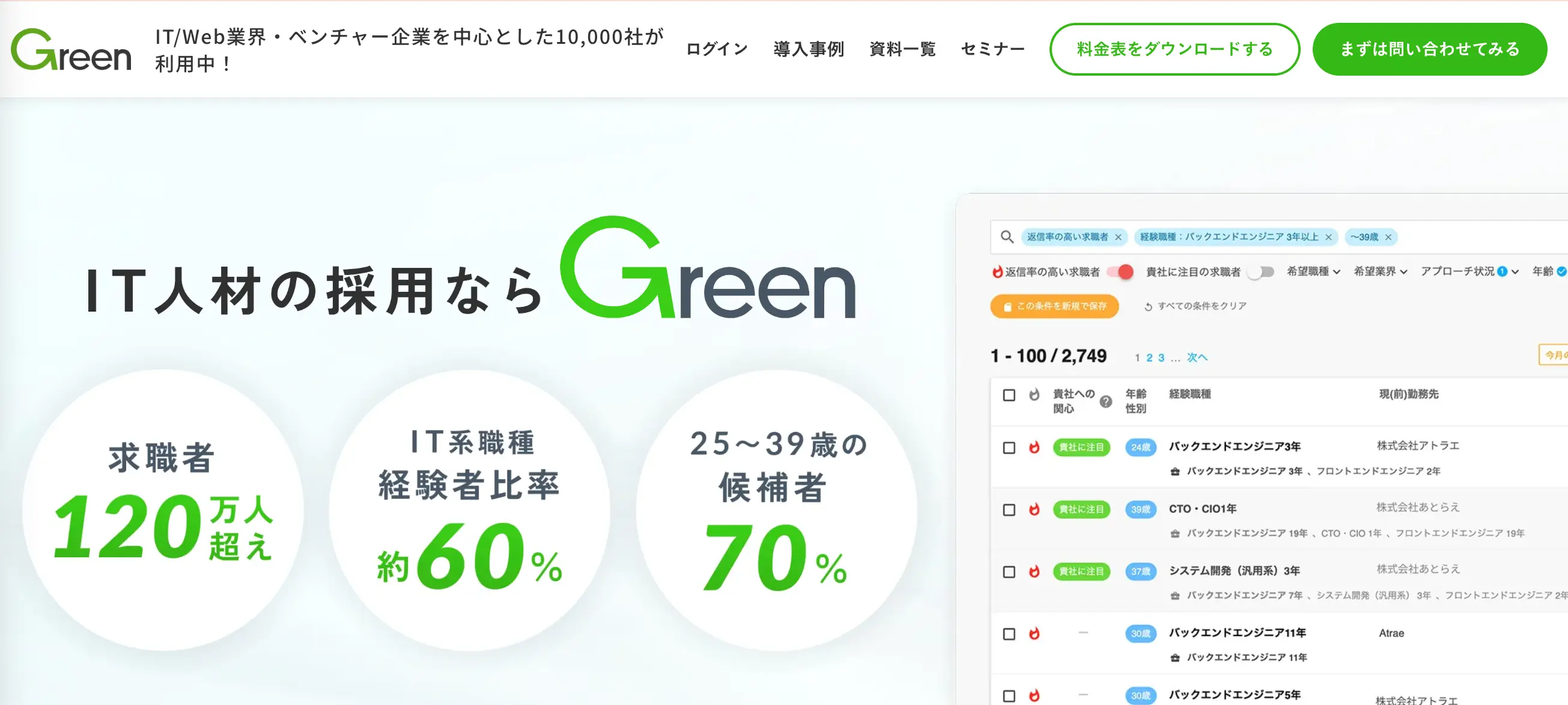 Greenは、エンジニアやデザイナーなどIT・Web業界の経験者採用に特化した求人メディアです。