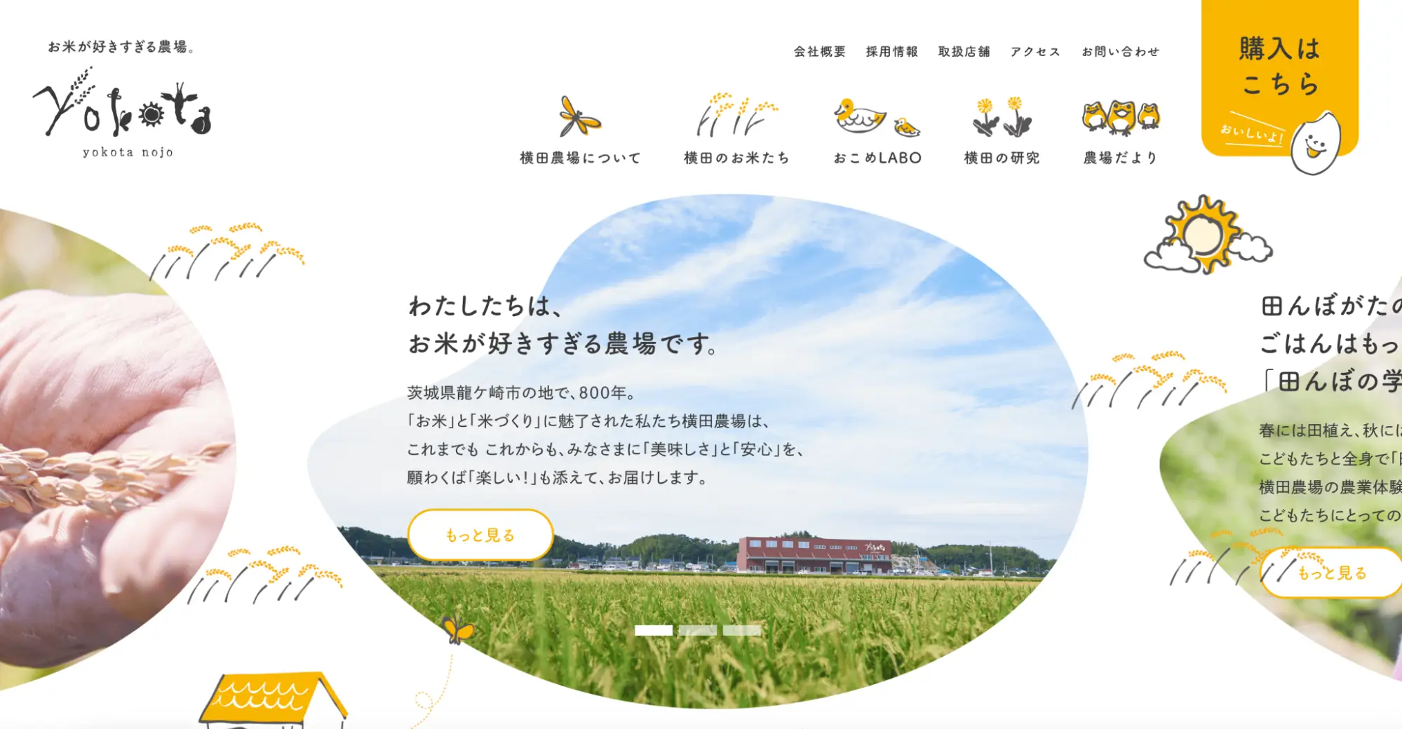 トップページでは「わたしたちの理念」「取り組み」「事業」といった各コンテンツ名称をトップページに縦書きで表示することで、コンテンツが切り替わるレイアウトを採用しています。これにより、ユーザーは必要な情報にスムーズにアクセスできます。