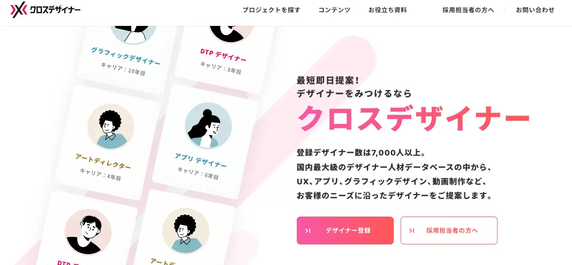 クロスデザイナーは、国内最大規模の7,000名以上のデザイナーが在籍するデザイナー専門エージェントサービスです。審査通過率5%を突破した採用難易度の高いデザイナーを、最短即日で提案することができます。