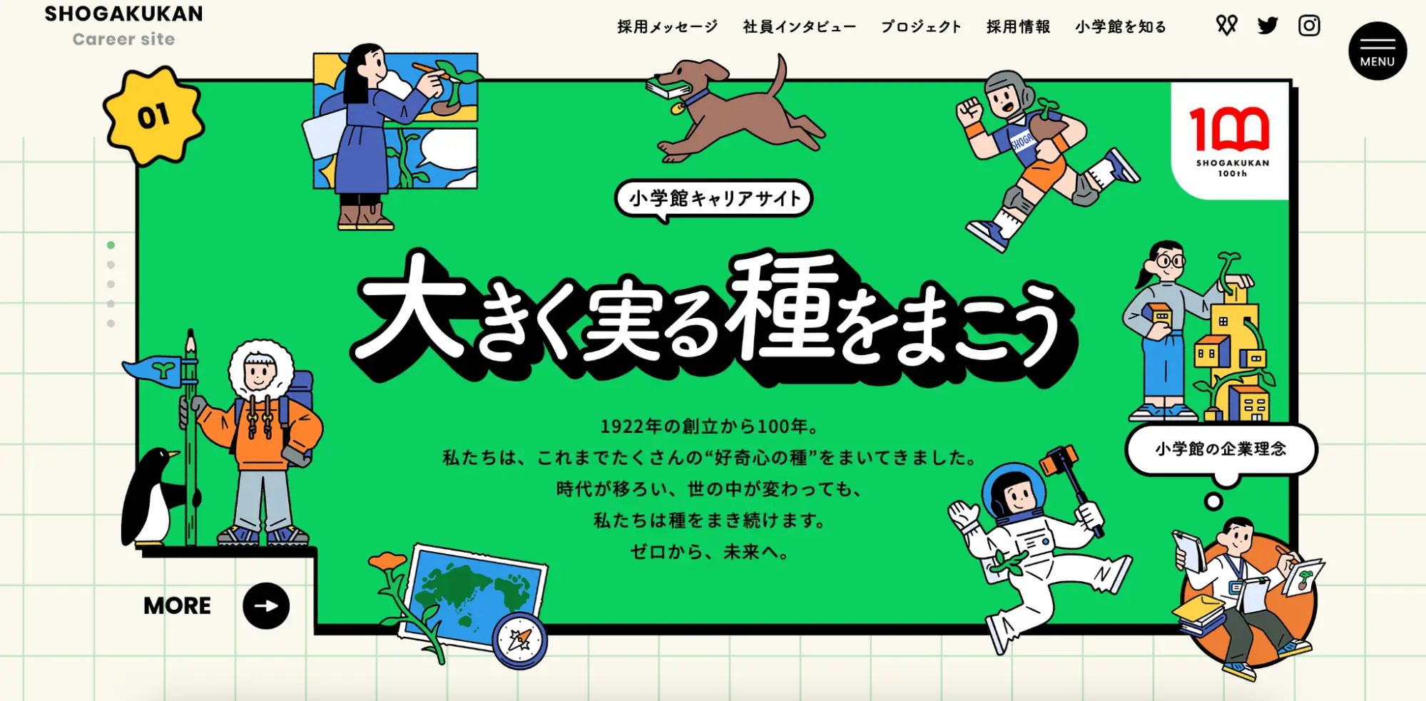 株式会社小学館の採用サイトは、「好奇心」や「変」というコンセプトを掲げ、社員の好奇心や夢、1日のスケジュールだけでなく、少し変わったエピソードを盛り込んで、楽しげな印象を受けるように作られています。
