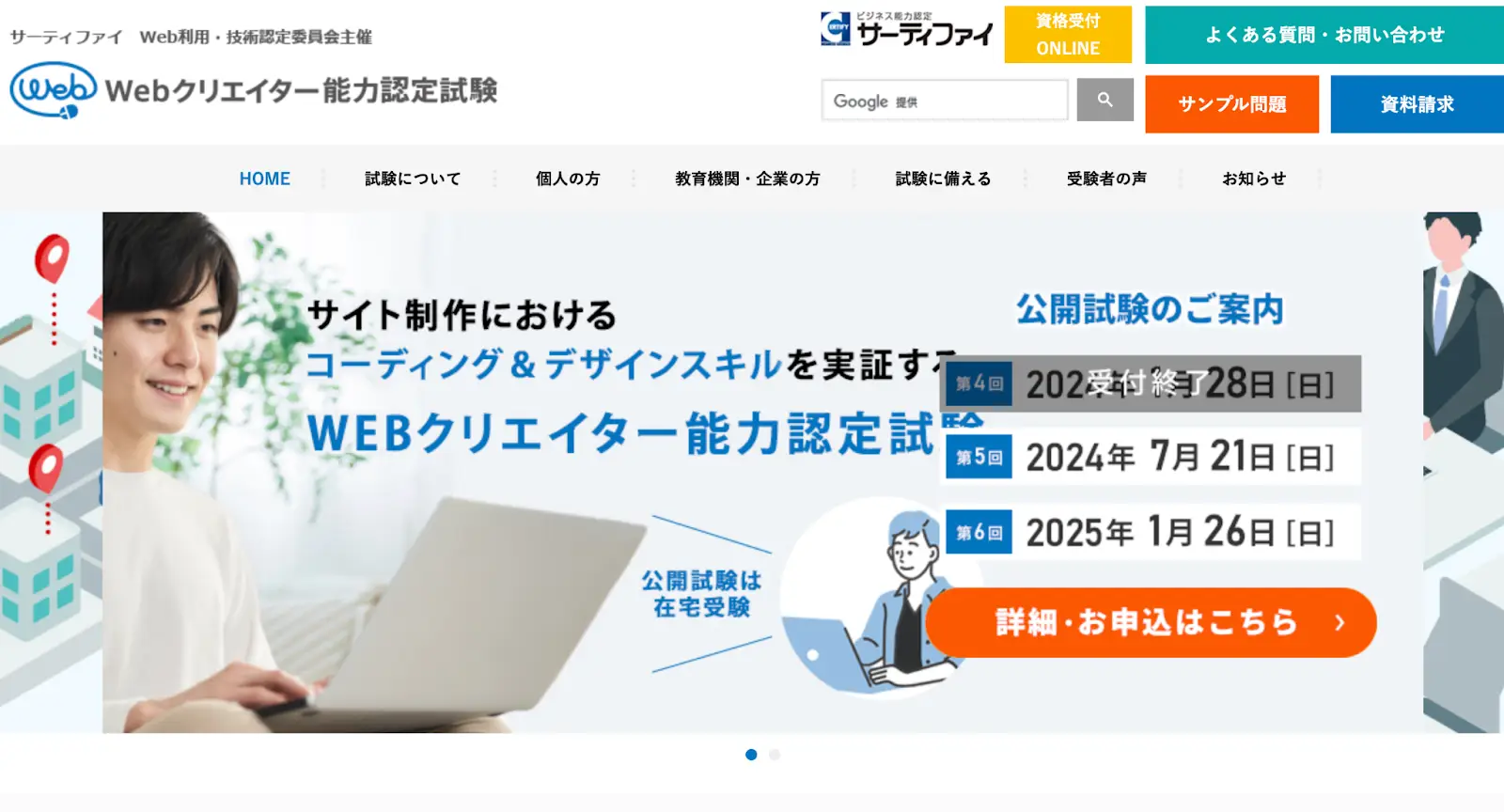 Webクリエイター能力認定試験とは、ビジネス能力検定のサーティファイが主催するWebサイトを作成するために必要なコーディングの能力や、デザインの能力が求められる民間資格です。実技試験のみのスタンダードと、実技試験と学科試験が実施されるエキスパートの2つのレベルがあります。受験資格はなく、未経験者でも受験可能です。現場の実情に沿った実践的スキルの証明となります。