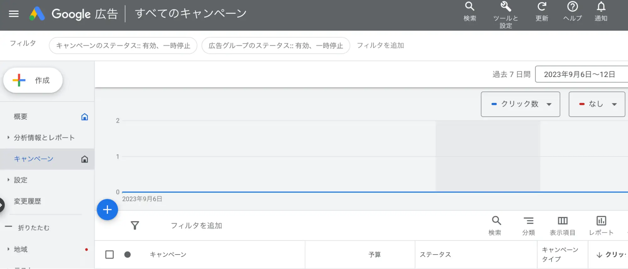 サイドバー「キャンペーン」タブをクリックし、青の「+」をクリックします。