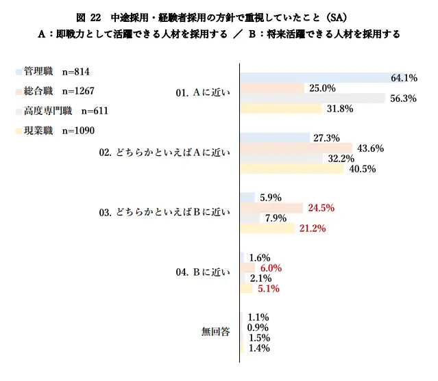 厚生労働省の調査によると、中途採用・経験者採用を実施している企業のうち 約64.1% が「即戦力、またはそれに近い人材」を採用方針として最重要視していますが、それに応じた人材確保は簡単ではありません。